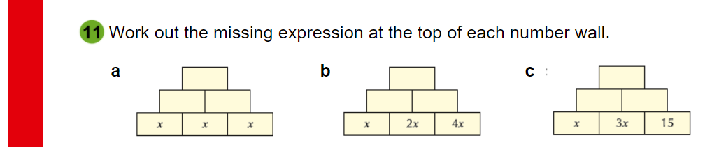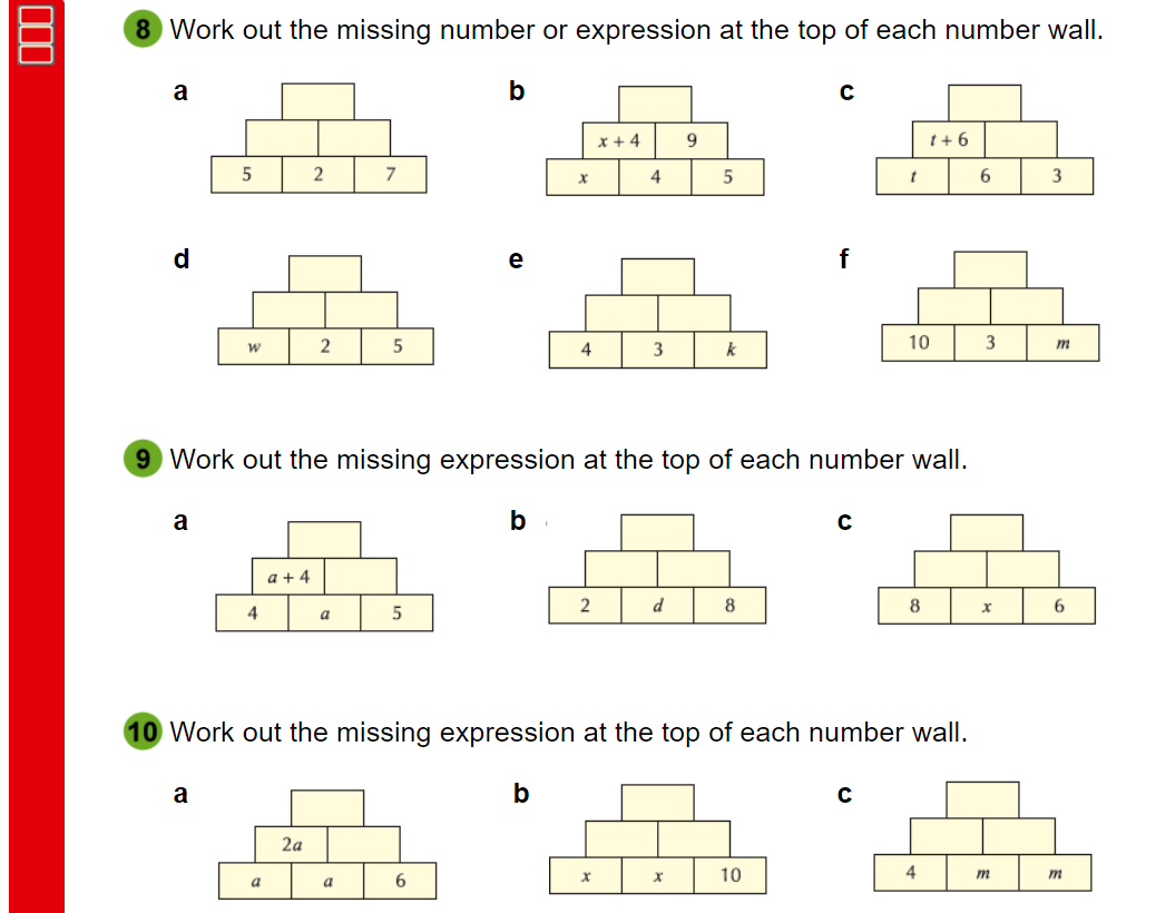 Extra: NB On number walls you have to add to bricks to find what will be in the brick above eg on Qu 8a you add the 5 and 2 to get 7 in the brick above, add 2 and 7 to get 9 in the brick above then the top brick will end up with 7 + 9 = 16